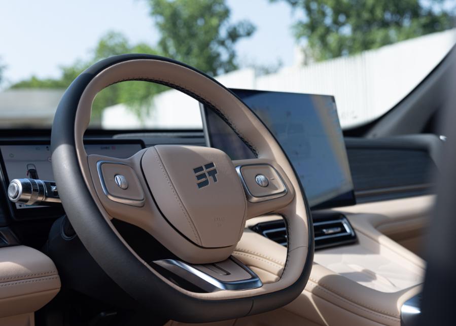 车内部分同样非常经典,采用了黄色的内饰造型,但整体配色偏向于浅色系列。中控部分与问界或者理想新车基本是如出一辙的设计,采用了对开式中央扶手以及两个超大的杯托。此外,座椅柔软而宽大,有着非常舒适的乘坐性。除此之外,为了进一步提升车内的空间,还采用了电子怀挡设计,而且我们在方向盘按钮上看到该新车似乎搭载了智能辅助驾驶系统,我们认为这项配置不会缺席。