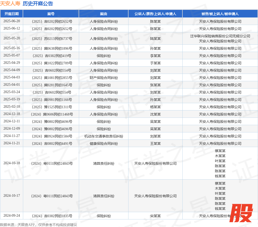 本站消息,根据天眼查APP显示,近日公布了一则天安人寿保险股份有限公司作为被告/被上诉人的开庭公告点金股,详细内容如下: