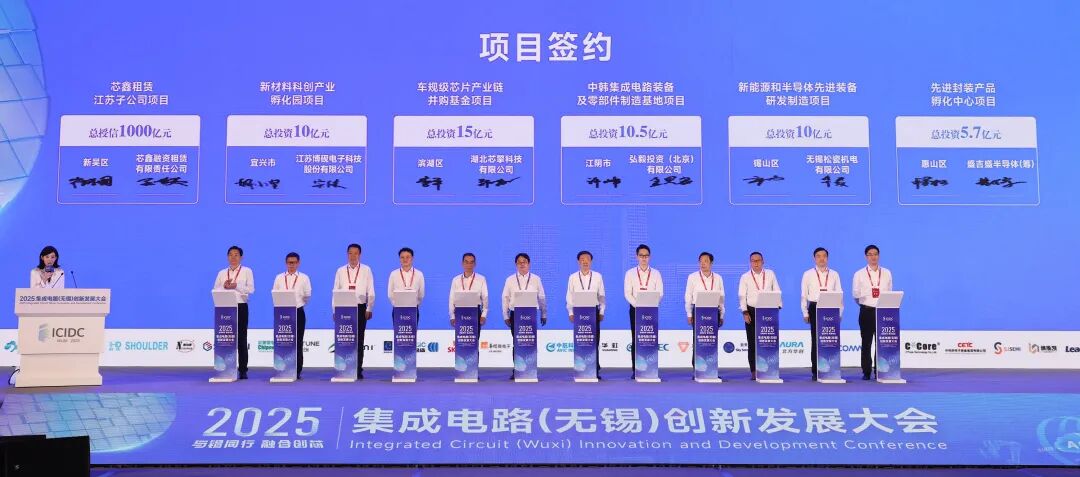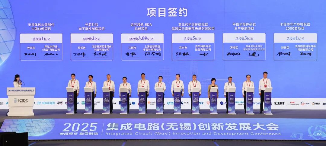 本次大会共签约57个项目,包括产业项目55项、总投资177.21亿元;产业金融2项,其中设立金融租赁公司1家,总授信1000亿元。现场,江阴市中韩集成电路装备及零部件制造基地项目、宜兴市第三代半导体碳化硅晶圆级功率器件先进封装项目等12个项目举行签约仪式。