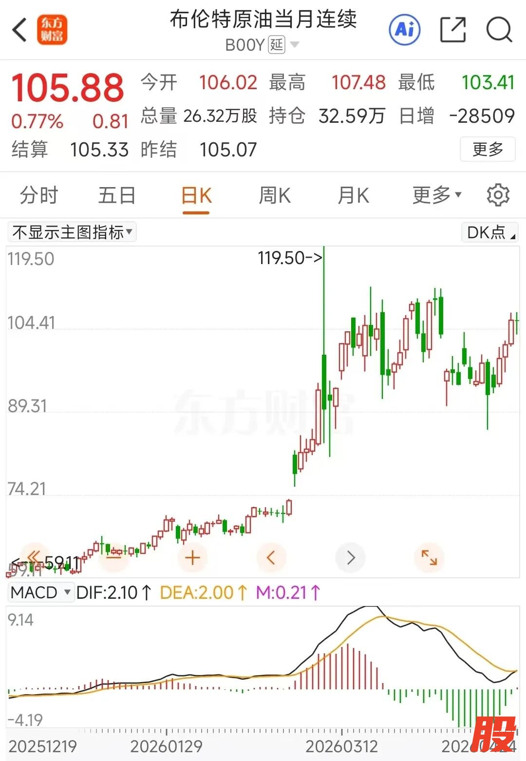 据券商中国报道,北京时间4月25日深夜至4月26日凌晨,原油暗盘一度直线拉升。布伦特原油暗盘、纽约原油暗盘涨幅均一度接近3%,此后涨幅略有回落。本周,布伦特原油呈明显反弹之势,周涨幅达17.15%,周五收盘时报105.88美元/桶。