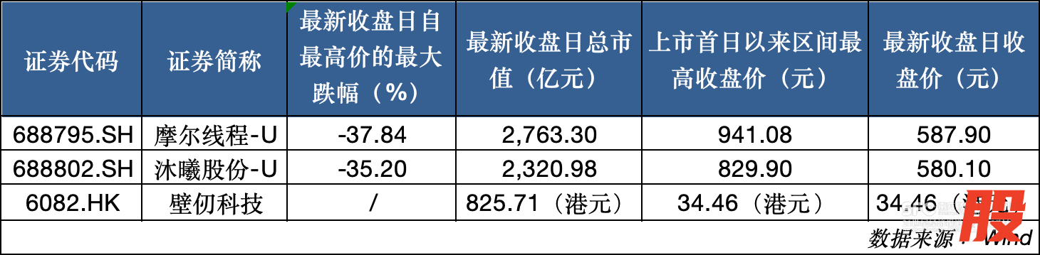摩尔线程、沐曦股份上市之日狂飙后,目前已经大幅回调近40%,分别自最高价回落超37%、35%。壁仞科技上市首日最终收涨不超过80%,总市值不到千亿港元,只有摩尔、沐曦市值的三分之一左右。