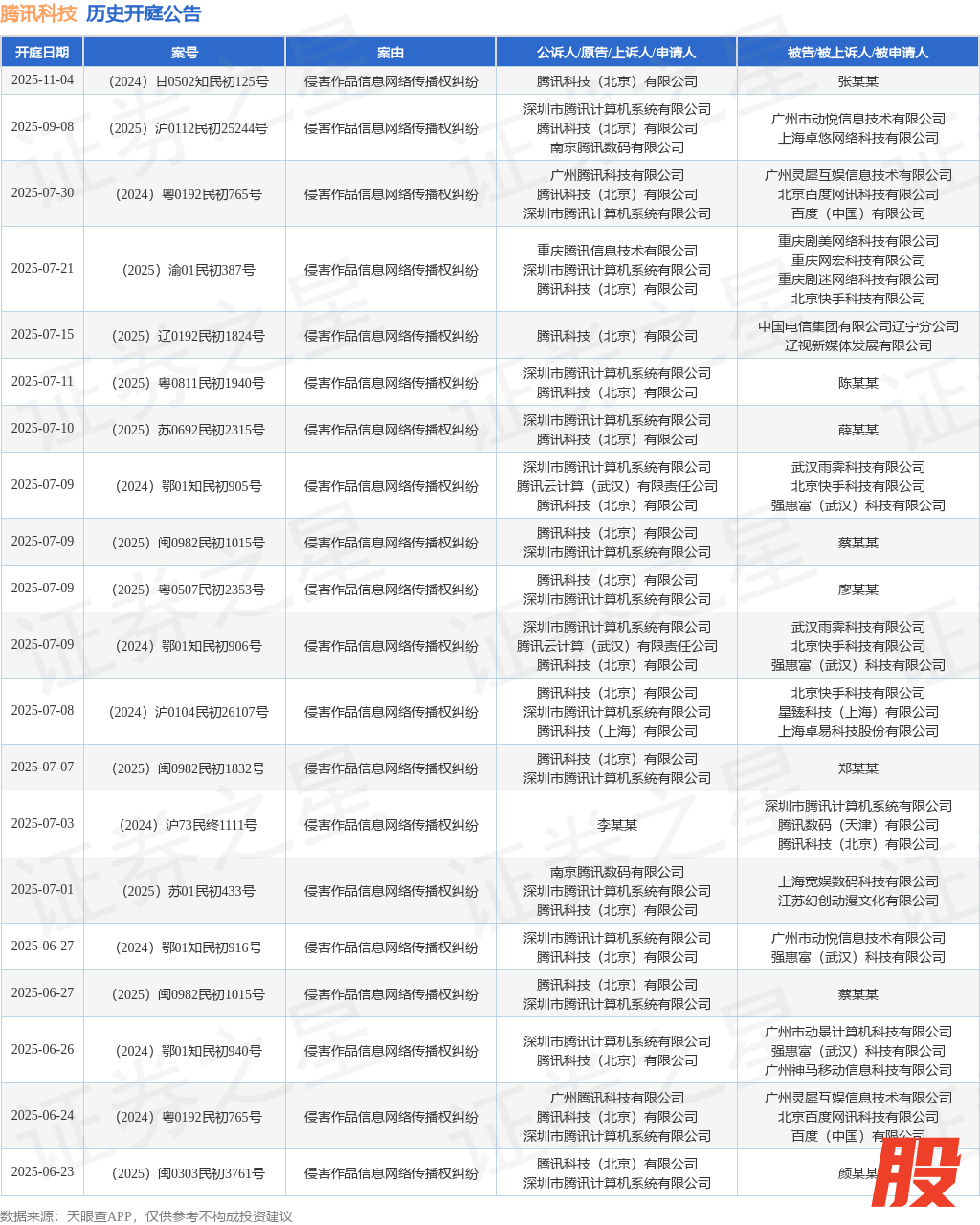 案号:(2025)浙04民初132号审理法院:浙江省嘉兴市中级人民法院案由:侵害作品信息网络传播权纠纷当事人信息: 原告/上诉人:深圳市腾讯计算机系统有限公司、腾讯科技(北京)有限公司、重庆腾讯信息技术有限公司 被告/被上诉人:北京无限维度科技有限公司、海宁神盾网络信息技术有限公司开庭日期:2025年6月20日根据统计,近一年内以腾讯科技(北京)有限公司为当事人的历史开庭公告有238则,其中案由为“侵害作品信息网络传播权纠纷”的公告以156则居首,其次为“不正当竞争纠纷”有24则,“著作权权属、侵权纠纷”有15则。历史开庭公告(前20条)如下: